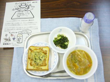 今日の給食はツナトースト・スープチャプスイ・わかめサラダ・牛乳です。スープチャプスイはお酢を入れたすこし酸味のあるスープ。好ききらいがでるかな?と思いましたが、「今日はお酢が入ってるんだよ」というと、「えっそうなの?」「たしかに酸っぱいね。」「でもおいしいよ」「もうすこし酸っぱくてもよかったな。酸っぱいの好きだから」と食べていました。