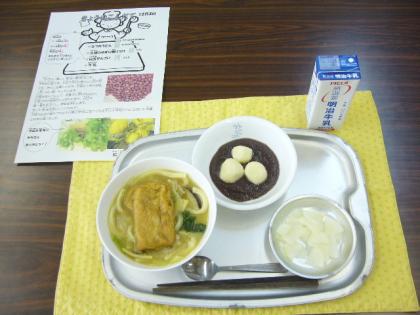 今日の献立はきつねうどん・大根のゆずの香りづけ・白玉ぜんざい・牛乳です。