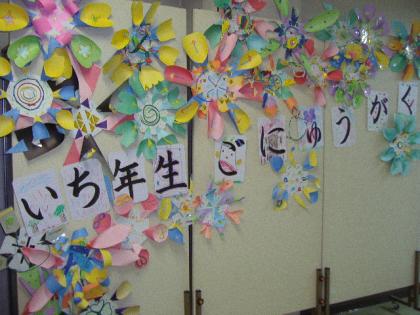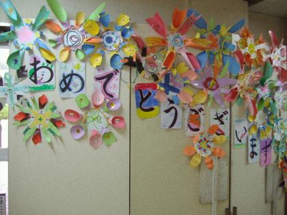 このお花は新5年生が作ってくれました。お祝いの花です。体育館の中には新3年生が作ってくれた花が飾られています。体育館への廊下や窓には新4年生、新6年生が作ってくれた花道の花が迎えてくれますよ。お教室には新2年生作の楽しい飾りがいっぱいです。ルンルンスキップしたくなりますよ。