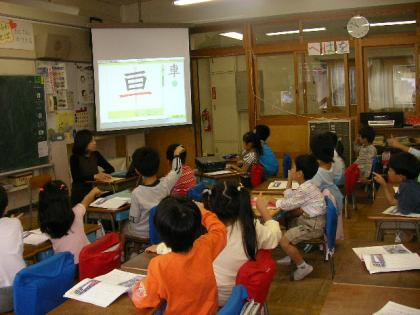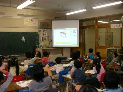 プロジェクターに映せる国語の教科書を使って、漢字を学習しています。漢字学習で筆順がスクリーン上に映し出されるので、みんなそらで筆順をなぞっています。みんなが一緒に同じ画面で学べるのが良いところです。