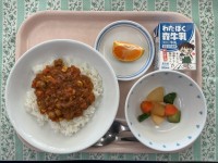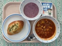 献立は大豆ピラフ、キャベツとトマトのスープ、スイートポテト、牛乳です。スイートポ...