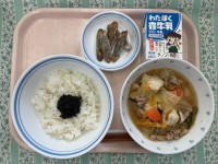 献立はごはん、大根のみそ汁、ししゃもの磯辺揚げ、春雨入り野菜炒め、牛乳です。しし...