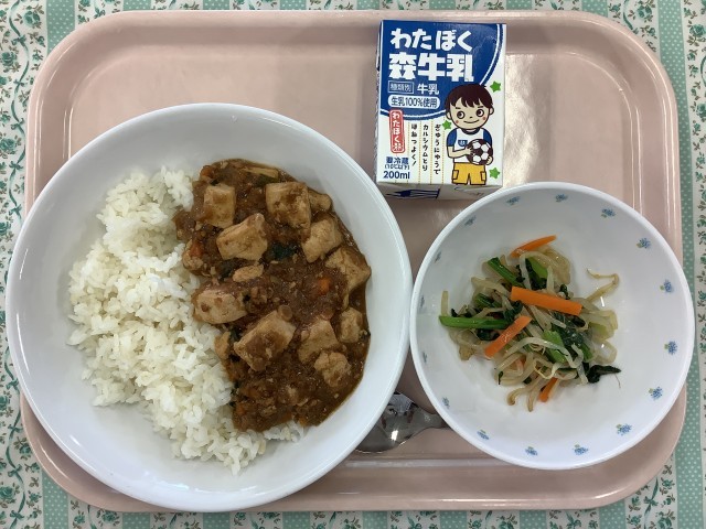 献立はご飯、麻婆豆腐、ナムル、牛乳です。