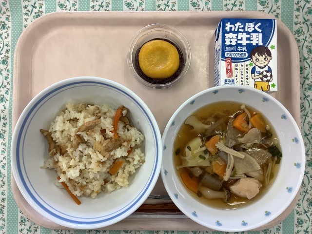 献立はきつねご飯、鶏肉ときのこの具沢山汁、月見団子(かぼちゃ団子とあんこ)、牛乳です。
