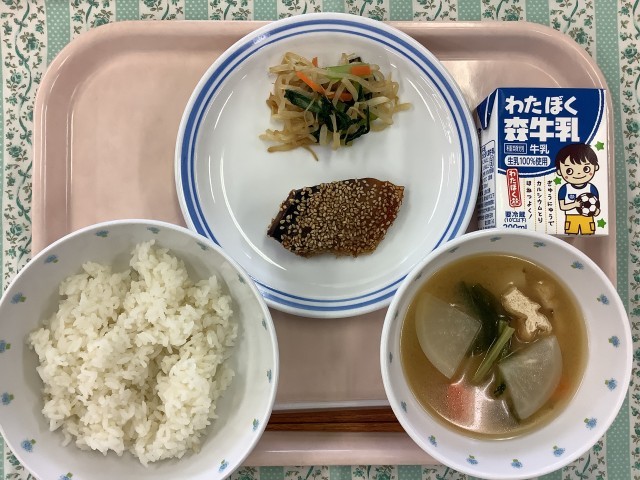 献立はご飯、かぶのみそ汁、鯖のごま味噌焼き、お浸し、牛乳です。