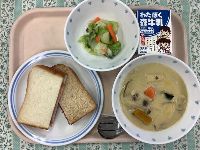 献立は二色サンド(苺ジャム・ブルーベリージャム)、秋野菜のシチュー、ドレッシングサラダ、牛乳です。