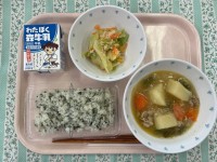 今日は食育の日、日本味めぐり〜北海道〜でした。鮭のちゃんちゃん焼きは今日は紙皿に生鮭にみそとバターを絡めた野菜を載せて焼きました。道産子汁もみそ煮込みの汁に最後バターを加えました。どちらの料理もみそとバターの風味にほっこりする味わいでした。