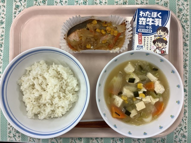 献立はご飯、道産子汁、鮭のちゃんちゃん焼き、牛乳です。