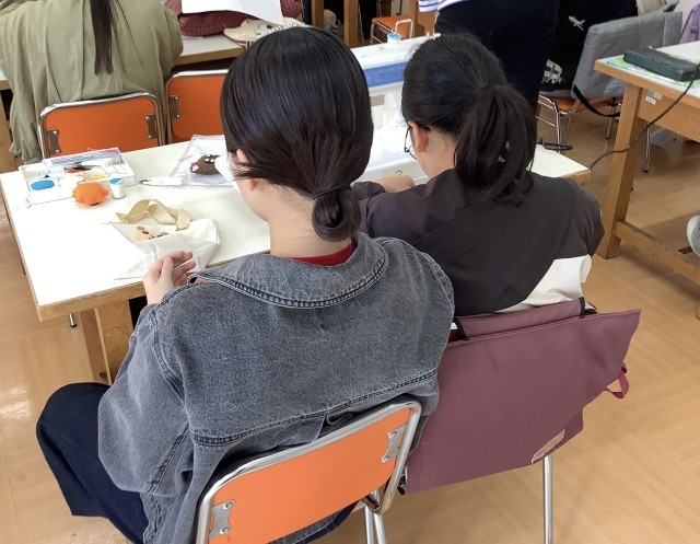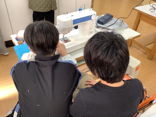 家庭科では、ミシンやアイロンを使って、生活に使えるオリジナルデザインのナップザックまたは手提げバッグを作っています。仕上がりに近付くにつれて難しいところも増えてきますが、みんなで教え合いながら楽しく作成しています。