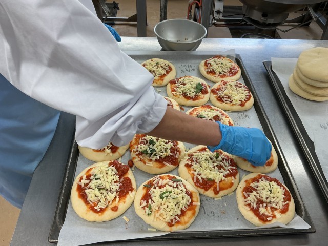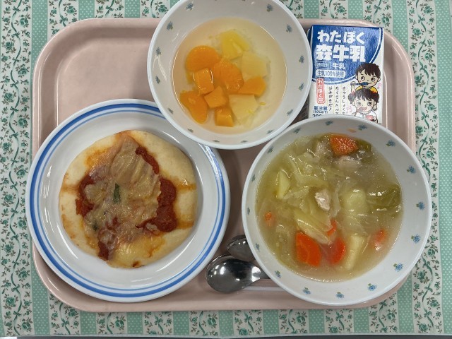 献立はマルゲリータ風ピザ、野菜たっぷりスープ、フルーツポンチ、牛乳です。