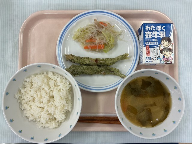 献立はごはん、大根のみそ汁、ししゃもの磯辺揚げ、春雨入り野菜炒め、牛乳です。