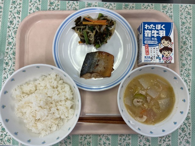 献立はご飯、呉汁、鯖の香味焼き、野菜の海苔和え、牛乳です。