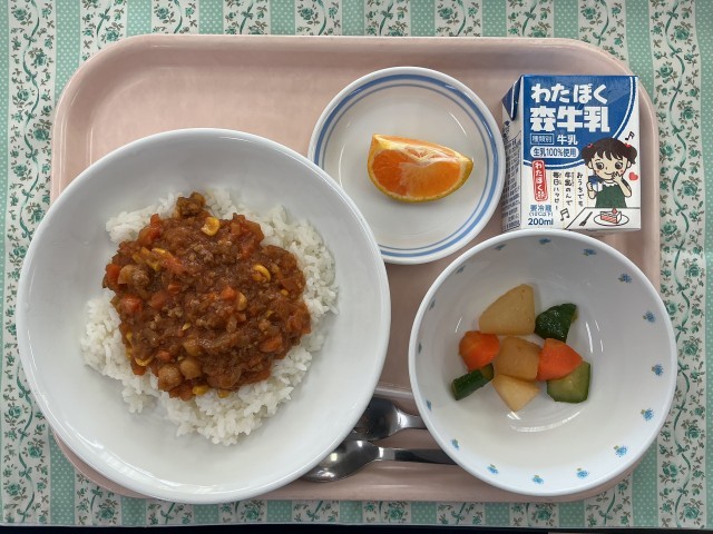 献立は有機人参のドライカレー、中華風野菜、柑橘(早香)、牛乳です。