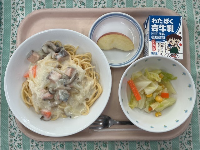 献立は鮭のクリームスパゲティ、ドレッシングサラダ、皮つきりんご(サンふじ)、牛乳です。