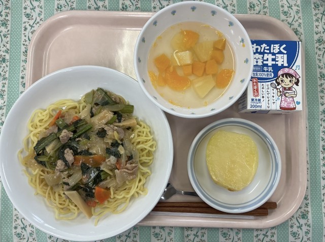 献立は豚肉と青菜のあんかけそば、じゃがいもバター、フルーツサイダーポンチ、牛乳です。