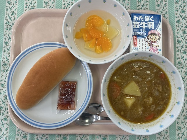 献立はコッペパン、苺ジャム、カレーシチュー、フルーツポンチ、牛乳です。