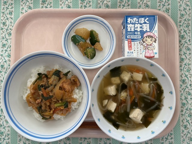 献立はキムチ丼、わかめスープ、ごまきゅうり、牛乳です。