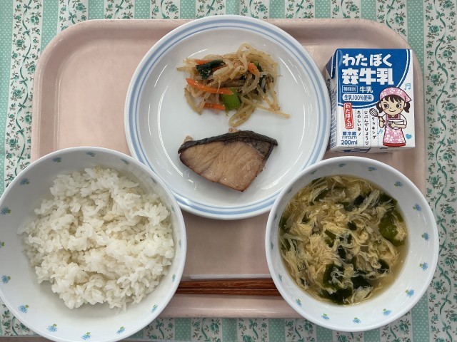 献立はご飯、かきたま汁、ぶりの照り焼き、糸寒天のごま酢和え、牛乳です。