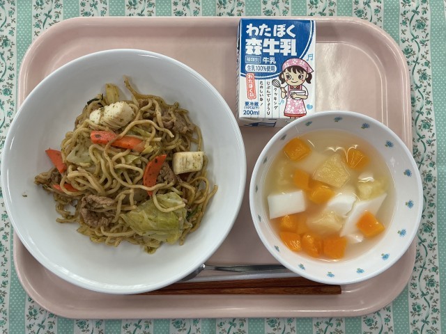 献立は豚肉といかのソース焼きそば、牛乳寒天入りフルーツポンチ、牛乳です。