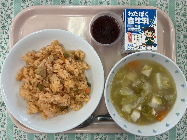 令和8年4月17日(金)の給食 公開日 2026/04/17 更新日 2026/04/17 八雲ランチ 献立はチキンライス、豆腐入り野菜スープ、グレープゼリー、牛乳です。」チキンライスもスープも1人分量がたっぷりありましたが、どの児童もしっかり食べていました。1年生も1週間経ち、慣れてきました。来週、給食当番が変わります。新しい当番さんには頑張ってもらいたいと思います。 いいね(0)