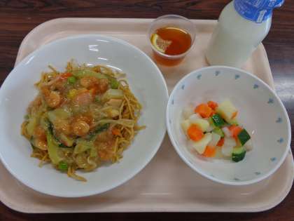 今日の給食:海鮮焼きそば コロコロサラダ 紅茶ゼリー 牛乳