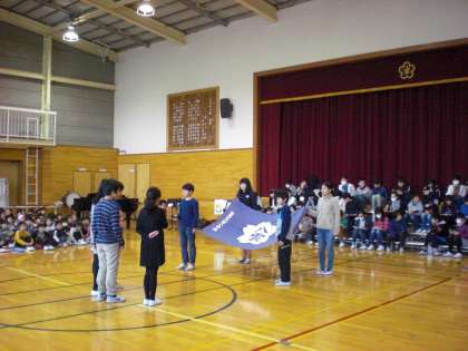 6年生からは、たてわり班の旗が送られました。