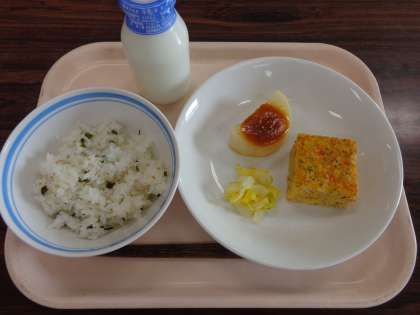 今日の給食:わかめごはん 千草焼き ふろふき大根