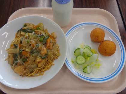 今日の給食:あんかけ焼きそば 大根サラダ じゃがまる 牛乳