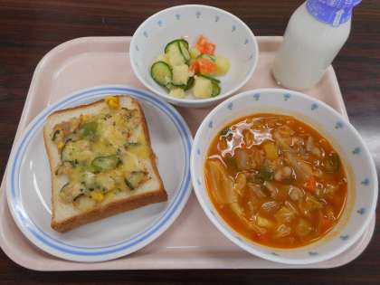 今日の給食:ツナトースト ミネストローネ 三色サラダ 牛乳