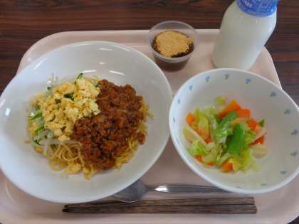 今日の給食:ジャージャー麺 ゆで野菜ドレッシングソースがけ