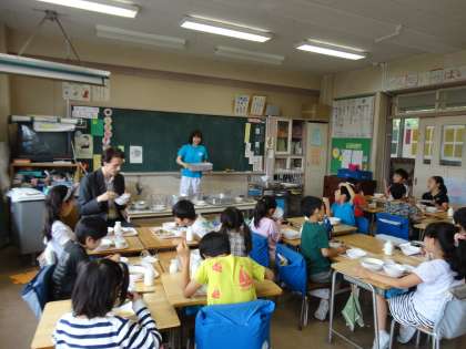 今日の献立に「トビウオのコロッケ」が出ました。ちょっぴりカレー味で、子供たちには大好評。「おいしいね!」「八雲小学校の給食って、レストランみたいね。」とにこにこして食べていました。栄養士の佐原先生が、本物のトビウオをみせてくだって、「うわあ、すごい!」と大喜びでした。