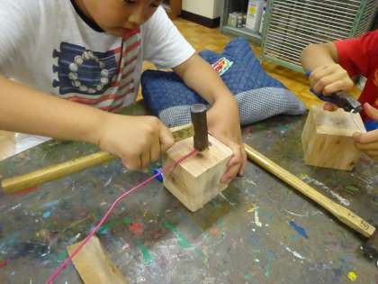 針金を釘で打ち付けて、ペンチで曲げて形を作ります。