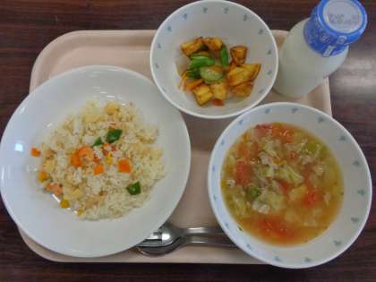 今日の給食:シーフードピラフ トマトスープ あげじゃがサラダ 牛乳