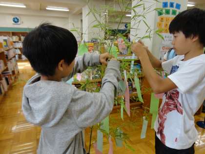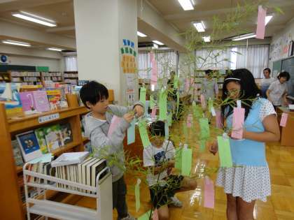 図書委員会が短冊におすすめ本の題名、おすすめコメント、分類番号を書いて飾りました。図書室に来た人は、短冊を見て本を決めたら、分類番号を手掛かりにして本を探して読みます。たくさん読んでもらいたいですね。