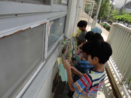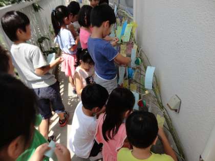もうすぐ七夕です。今日は、子供たち一人一人が短冊に願い事や夢を書いて、笹に飾りました。