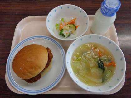 今日の給食:フィッシュバーガー 冬瓜とひき肉のスープ