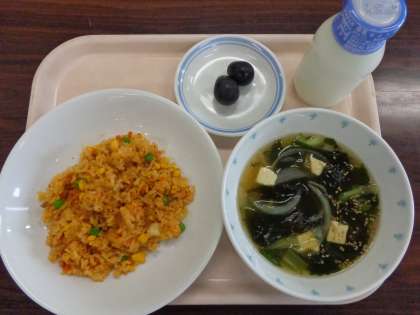 今日の給食:キムチチャーハン チンゲン菜とわかめのスープ