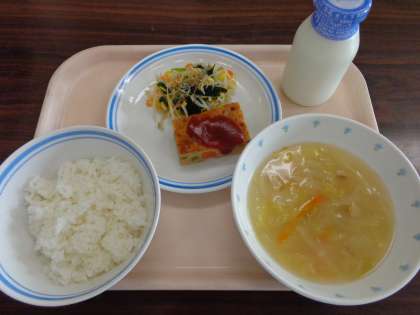 今日の給食:ごはん キャベツとベーコンのスープ ミートローフ