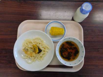 今日の給食:冷やし天ぷらうどん ゆでとうもろこし  牛乳