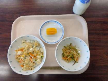 今日の給食:豆腐と卵のどんぶり  かみかみ和え