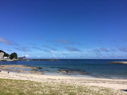 興津海岸に着きました。晴れているので、海の色は最高です。