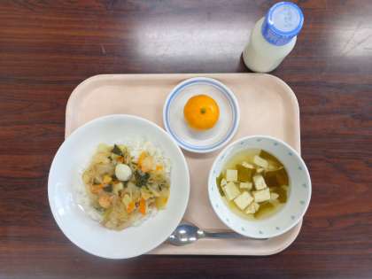 今日の給食:中華丼 ワカメスープ 冷凍みかん 牛乳