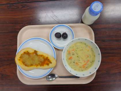 今日の給食:ナンカレーピザ コーンクリームスープ  ぶどう(巨峰)