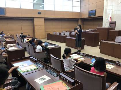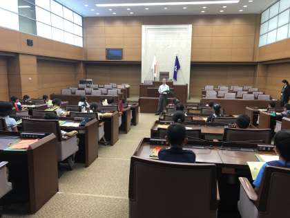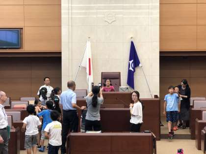 次は、目黒区役所の見学です。普段入ることができない区議会議場の見学にみんな大興奮です。