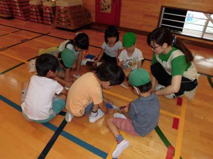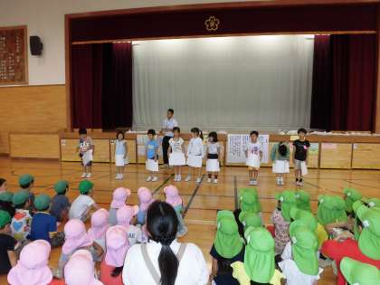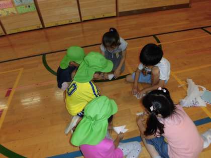 生活科の学習で、保育園の子供たちとの交流会をしました。一緒にじゃんけん列車をして遊んだり、折り紙でアサガオの花の折り方を教えてあげたりしました。