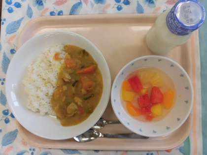 今日の給食:夏野菜カレーライス すいかパンチ 牛乳