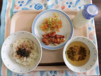 今日の給食:冷やし茶漬け いかと大豆のかりん揚げ 野菜の香味和え