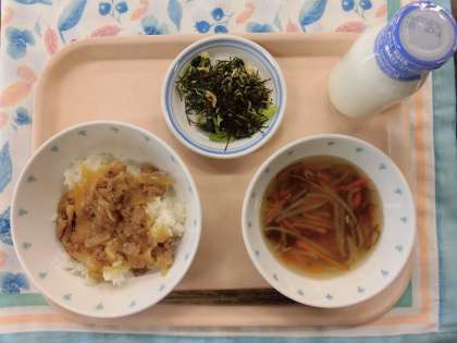 今日の給食: すき焼き丼 もずくスープ キャベツとのりのサラダ