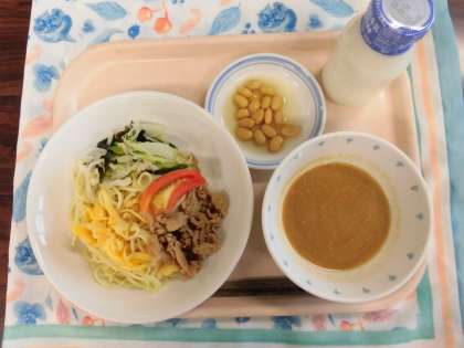 具はきゅうり、もやし、キャベツ、わかめとトマト、錦糸卵、豚肉を甘しょっぱい味付けしたものを載せました。ぶどう豆は大豆を甘く煮た料理です。時間をかけてじっくり煮ることで、つやが出てぶどうのように仕上がることが名前の由来です。 冷やし中華は好評で麺はほとんど残っていませんでしたが、野菜が残っていたので、もう少し野菜を食べられるように工夫をしていこうと思います。