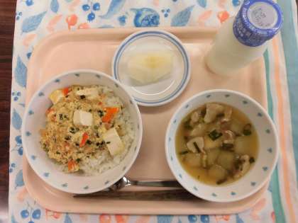 今日の給食:豆腐と卵のどんぶり 冬瓜のお吸い物 なし 牛乳
